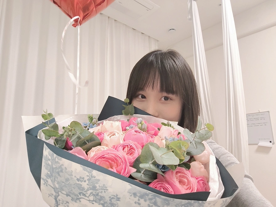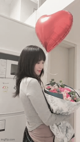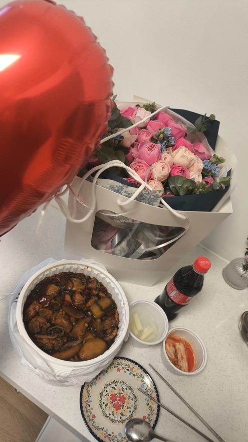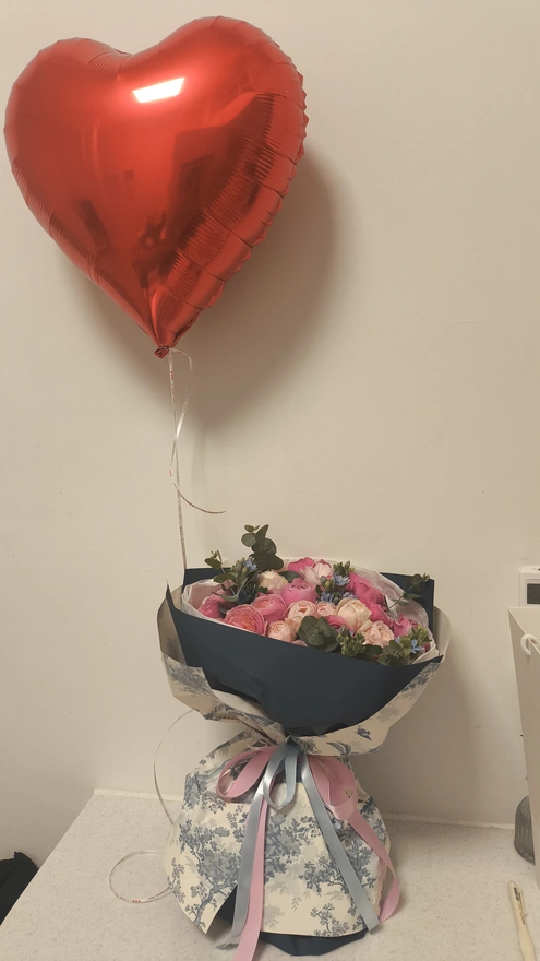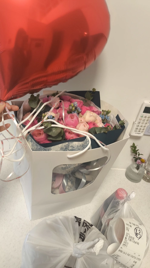 집에 와보니 풍선 딸린 꽃바구니가 있었다><
