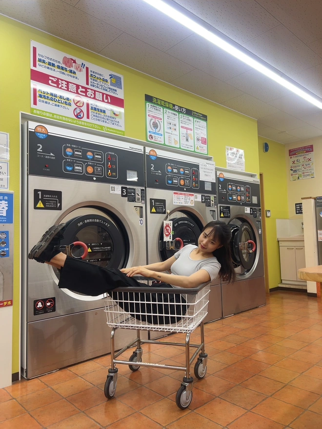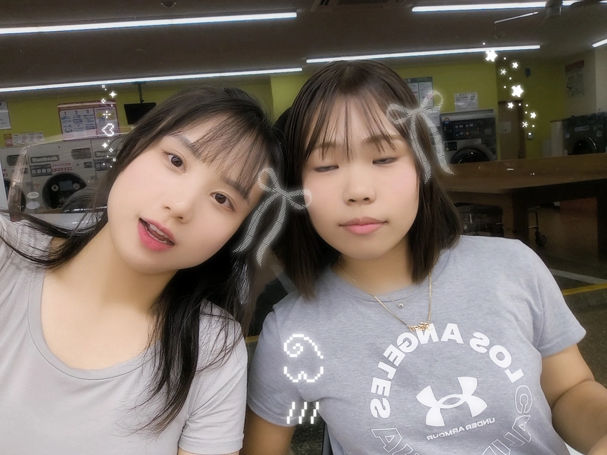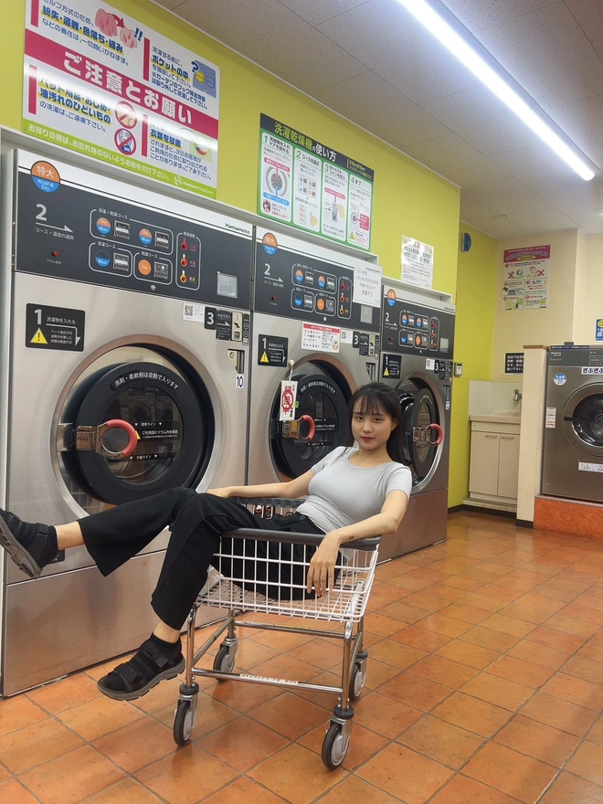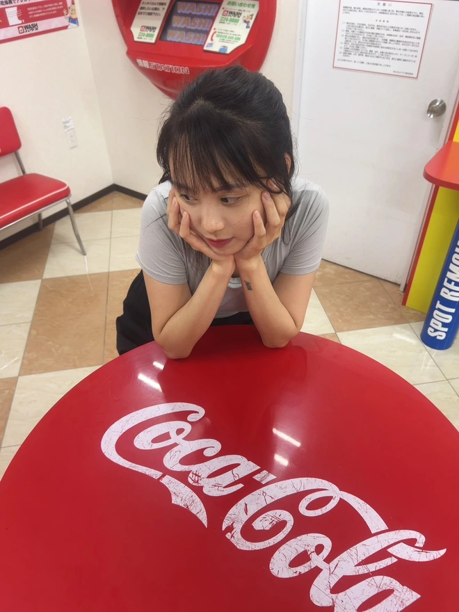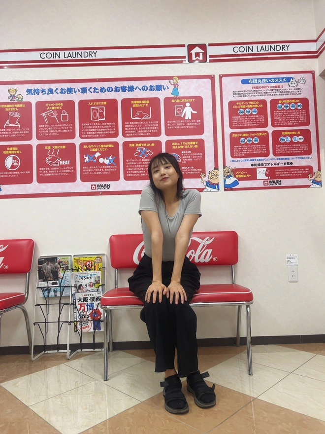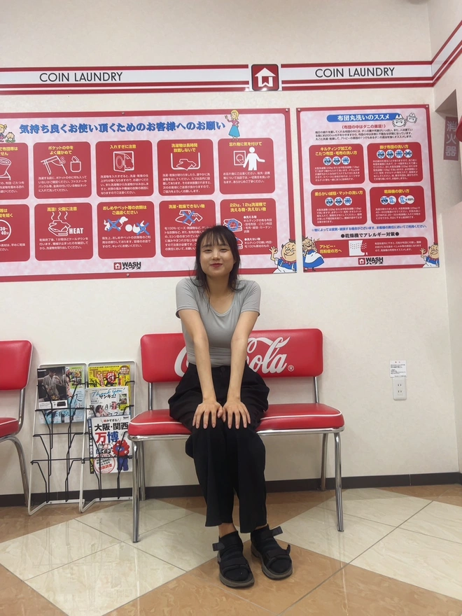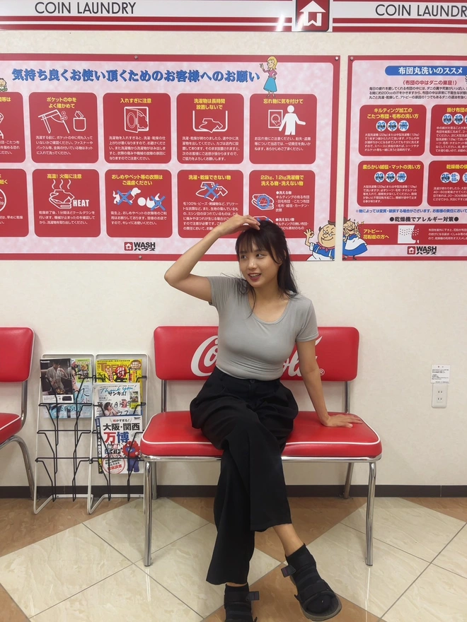 6.仕事終わったらシオンちゃんが直ぐきた。8時40分のごろた、まだ時間がある。外は暑いだから涼しい場所を探した。その近くちょうどにコインランドリー店が二つあった。日本のコインランドリーなんては初めて中に入った。なんかめっちゃ広い、面白そう。可愛い赤色の洗濯機があった。ここで写真いっぱい取るながら沢山おしゃべりした。