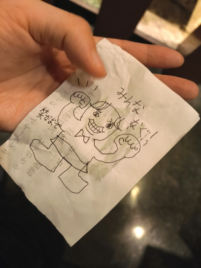1.9月15日はディンの誕生日だ。けど仕事の日だから、夜一緒に働いた。私は絵を描くことが得意なので、仕事中でも素晴らしい絵を描きてプレゼントした。人を毎日全力で殴、ディンちゃんのパワハラ日常姿を描かいました。「みんなを笑顔で殴る!」。チビのくせにパンチが怖いだ。これ見たらさ、ディンちゃんが不満な顔で言った。「今度はもっと髪の毛を入れてくれ」あー、そっちか!そっちのほうか!彼女の悩みが表れる反応だった。そしたら私は「髪がもっと欲しいの?じゃあ、誕生日プレゼントでカツラ買ってやろうか?」って言ったら、もう一回殴られたwwwwww。