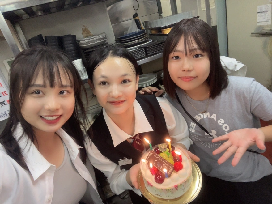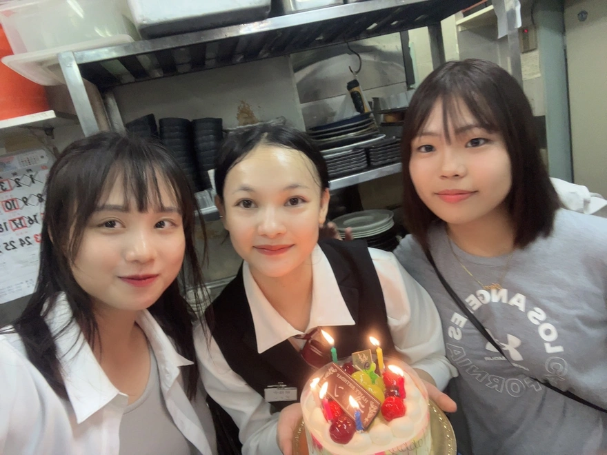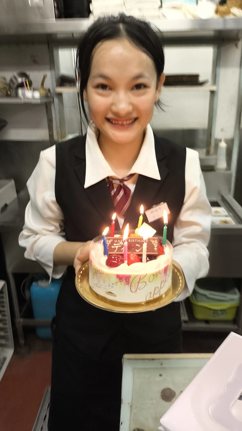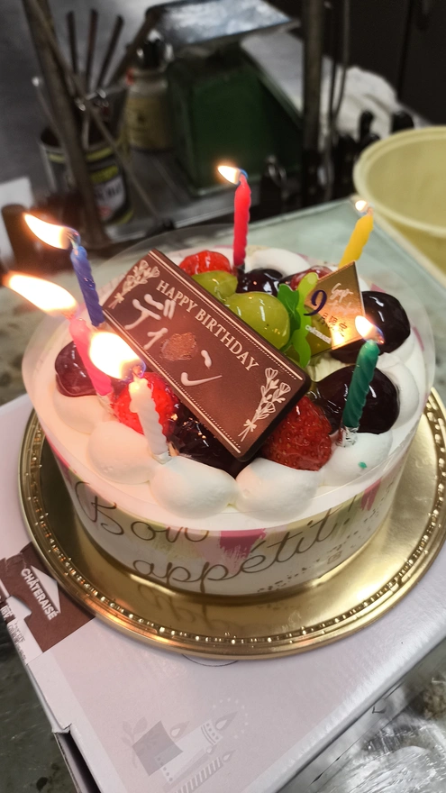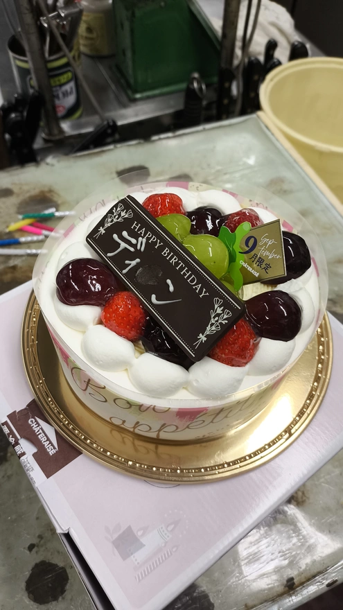 10.ディンちゃんが指でなぐたチョコプレートは3人分けて食べました。マネジャーさん一人、シェフさん3人、私たち3人で7人だった。マネジャーさんは甘いもの食べない、でもちょうどよかった、ケーキ分けるやすいwwwww。このケーキ私が選んだけど、めっちゃ美味しい。上はシャインマスカットとイチゴが載せている。中身にイチゴがもっといる。私は足りない、もっと食べたかった。毎日誰の誕生日にいきたいねwwwwwww。ちなみに、ケーキ代はシェフさんと分けて払った。