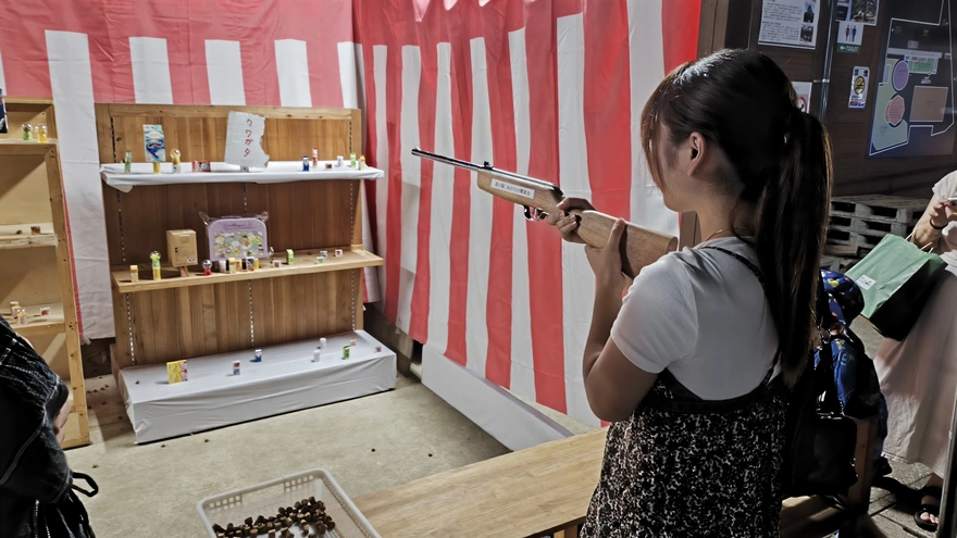 12.終わったあと、さっき屋台でもらったチケットのことを思い出した。「縁日」と書いてあって、ちょうど2枚もらったけれど、これで何ができるのかは知らなかった。そして、「縁日」と書かれている屋台に行ったら、かわいいゲーム屋台が3つくらいあった。私たちは射的を選んだ。弾は2発ずつもらった。