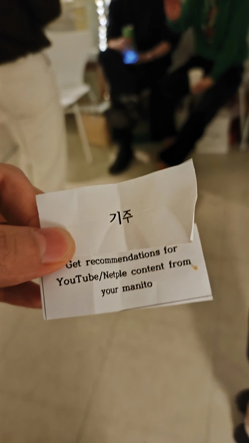 6. 이건 마니또 게임이라고 입장할때 받은 종이다. 마니또란 이탈리아어로 ‘비밀친구’라는 뜻인데, 상대방은 모르게 지정된 사람에게 말걸고 관심가져다 주는 게임. 새로운 사람들이 많을때 친목다지기 좋은 게임이다. 나는 저 ‘기주’라는 사람에게 말을 걸어야했다.🧐 미션도 쪽지에 적혀있다. 유튜브나 넷플릭스 컨텐츠를 추천받기! 이 미션이 실패할 경우 벌칙도 있다고 한다. 포인트는 내가 비밀친구인거 들키지 않게 미션을 완수 해야한다! 나는 기주가 누군지도 모른다. 그래서 아는 친구에게 도움을 받아 그 친구에게 말을 걸었다.
