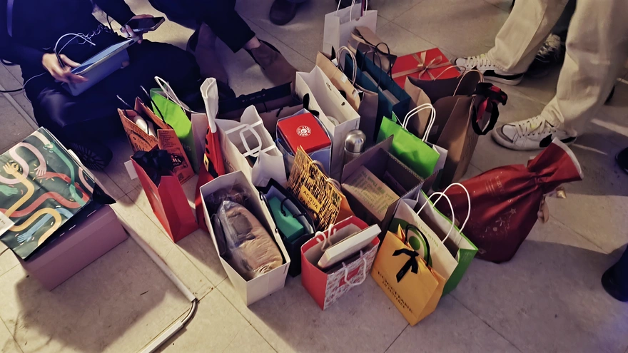 10. 대망의 선물교환 시간이 다가왔다🎁. 모두 흩어져있던 선물을 한 가운데로 모았다. 약 30명이 준비한 30여개의 선물 주머니들. 동심가득해지는 순간이다. 하지만 안에 어떤 물건이 들었는지 알 수 없다. 아까 영화 맞추기 게임에서 일등한 팀에서 먼져 선물을 골랐다. 선물을 고르면 그걸 준비한 사람이 선물을 설명 한 다음에 자신도 고르면 된다. 나는 마지막쯔음 핑크색 박스를 골랐다. 핑크색을 좋아해서 남은 핑크색 박스를 골랐는데 와우! 정말 놀라웠다! 이건 미키마우스 유아용 가방이잖아! 너무 좋아서 표정관리가 안됐다 ㅋㅋㅋㅋㅋㅋㅋㅋㅋ🎅 바로 어깨에 매 보았는데 사람들이 하나같이 다 입모아 잘 어울린다고 했다. 이 나이에 다이소 디즈니 유아용 크로스백이라니 와 정말 너무 기쁘다ㅎㅎㅎㅎ