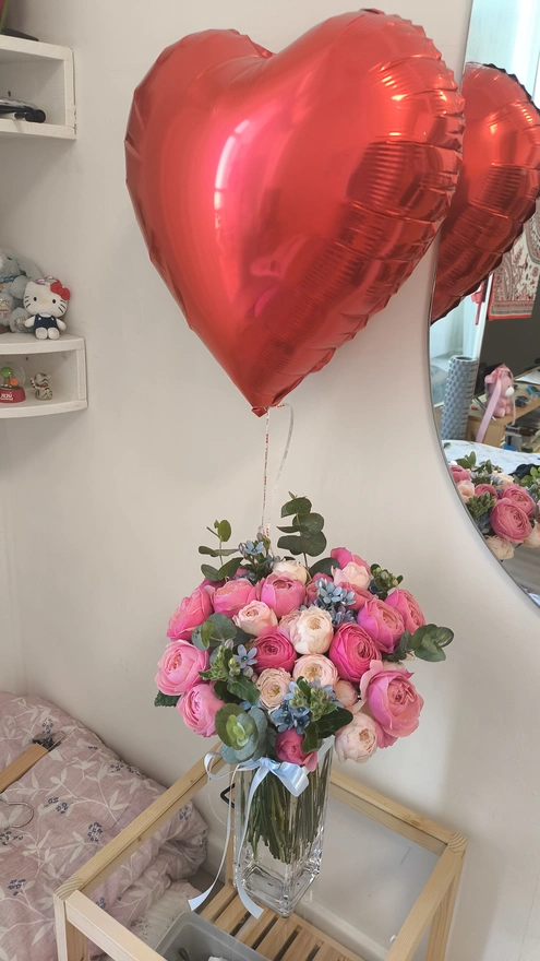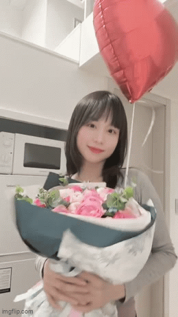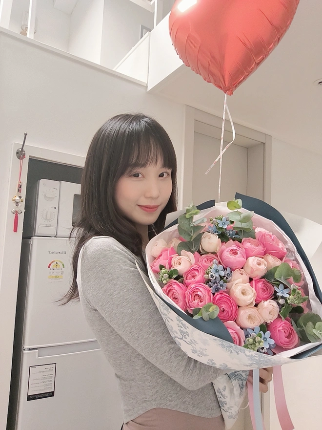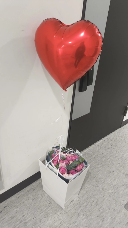 집에 와보니 풍선 딸린 꽃바구니가 있었다><