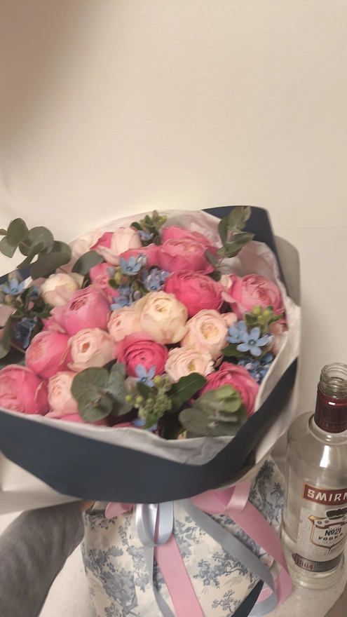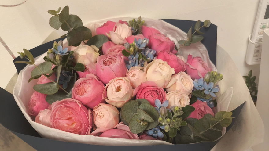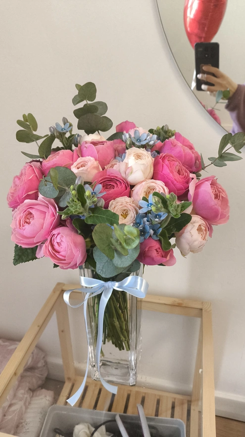 실바핑크 장미 몇송이인지 안세어 봤는데 엄청 많았다. 연핑크와 분홍색 장미랑 작은 파란색 꽃 진짜 예쁘다.