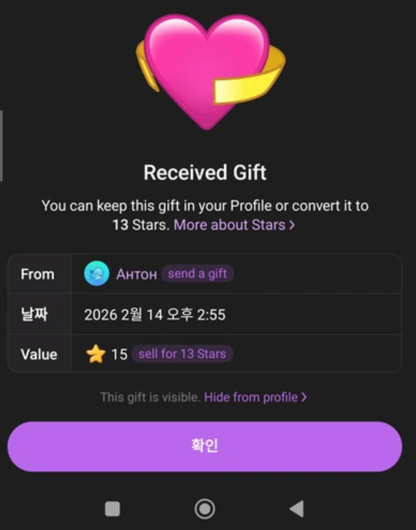 낮에 텔레그램으로도 하트의 무언갈 받았다. 어떻게 쓰는지는 잘 모르겠지만 기분은 좋다!