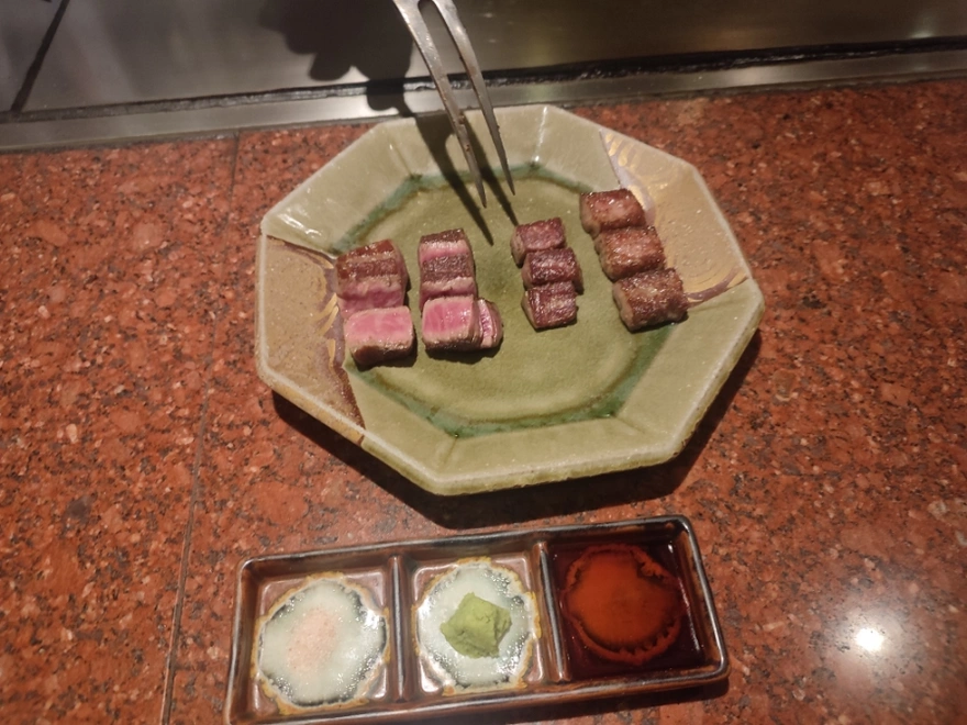 10. このようにシェフが焼いてくれました。左側はサーロインのレアとミディアム、右側はヒレのレアとミディアムです。醤油かわさびか 塩につけて食べます。「どっちがもっと美味しい?」とベトナム 友達に聞いたら、彼女はヒレのミディアムを選びました。私は逆に、脂の多いサーロインのレアが好みです。人それぞれ好みが違うので、どちらが一番美味しいかは自分次第です。