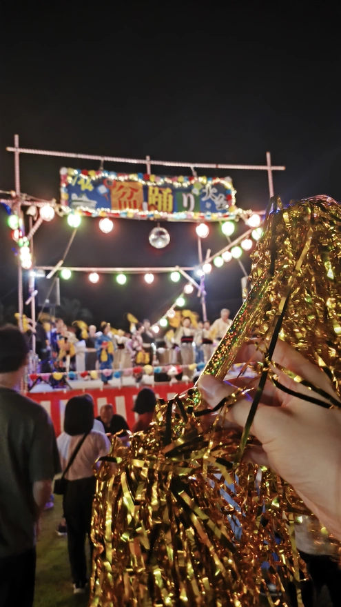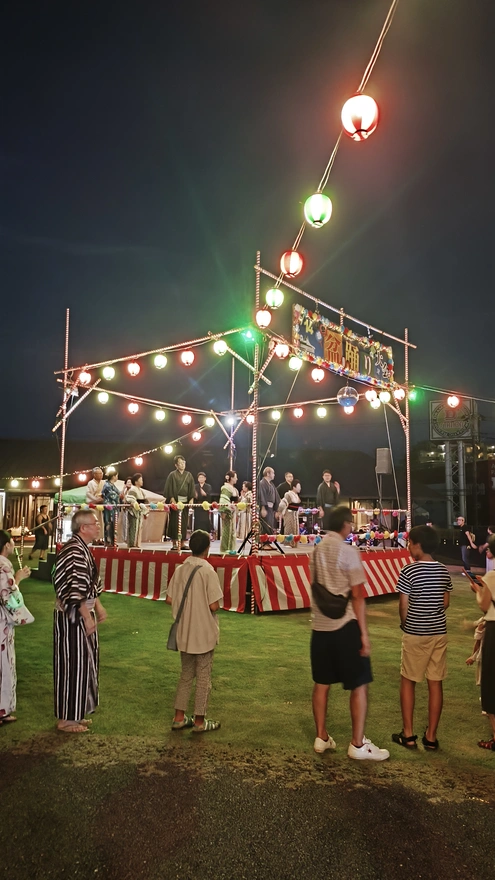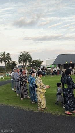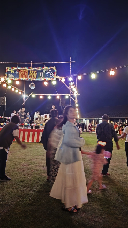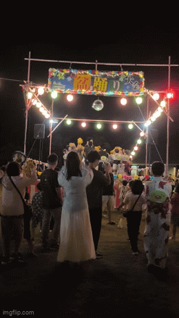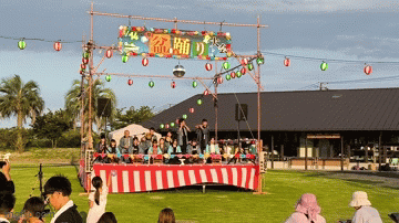 9.七時に空が黒くなって来たから本番の盆踊り大会が始まった。舞台の上で、浴衣を着たおばさんやおじさんたちが踊っている。司会を務めるおばあさんがマイクで観客に次の動きを教えている。盆踊りは優しいダンスだね、子供から老人、誰でも簡単に踊れる。競争するのではなく、みんなで一緒に楽しめる優しい文化だ!