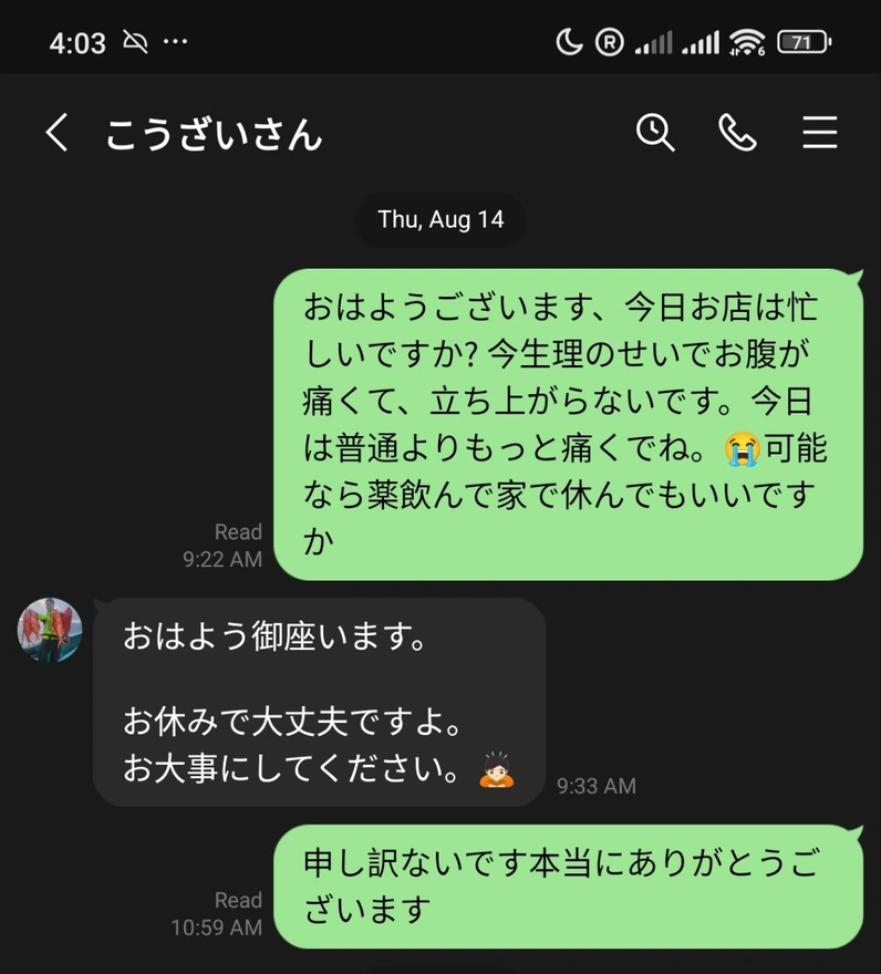 3.それは男の人には絶対わからない“女の世界”のこと。「すごく痛くて、立つことさえできません…」って、彼女が言ったとおりにマネジャーさんに伝えたら、本当に100%効いた。要するに、生理を理由に休むという作戦(笑)。なるほど、さすが天才沖縄人!こういうところに、頭がいいね!さ、そんなわけで、私とシオンちゃんの盆踊り大会での冒険がついに始まった。ちなみに私は、生理痛がまったくない。あははは><