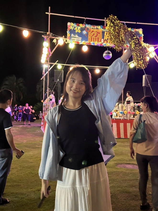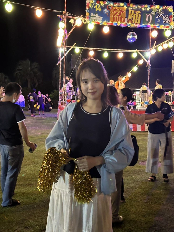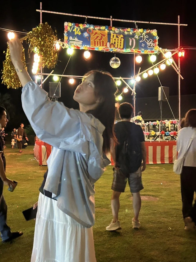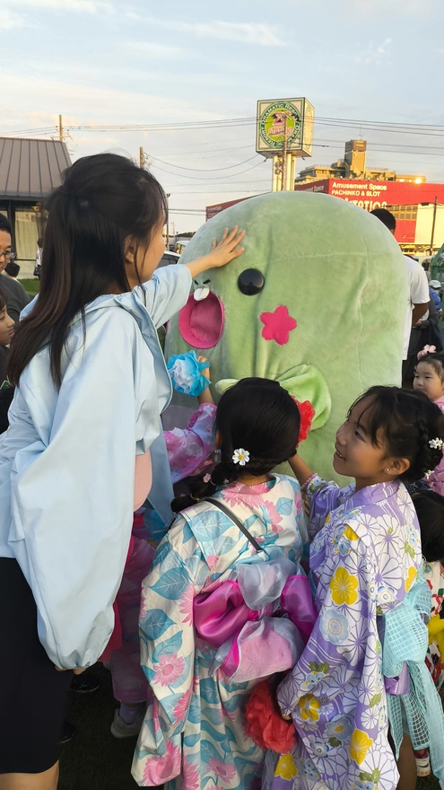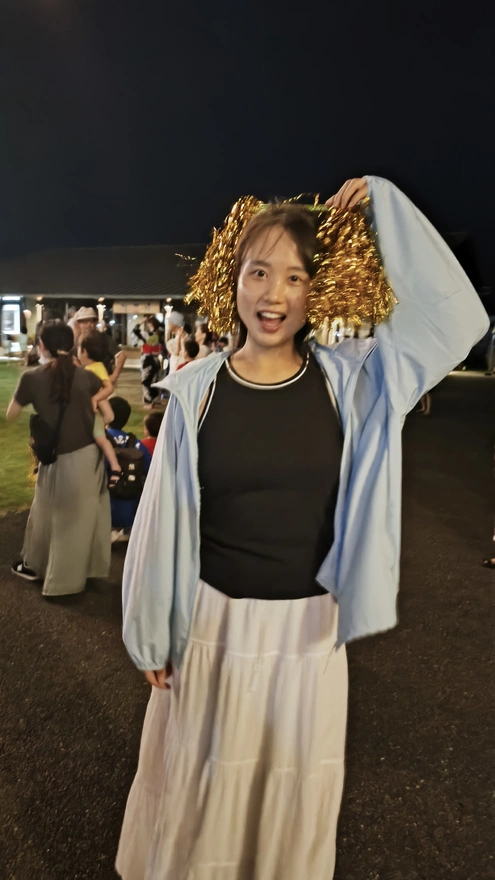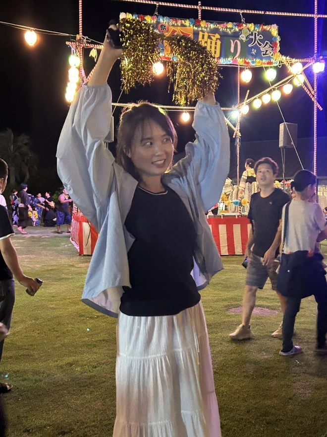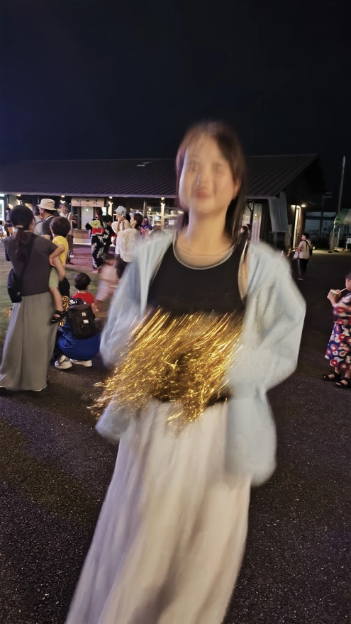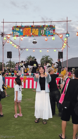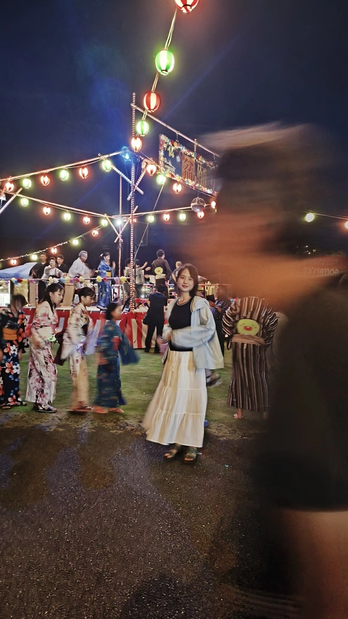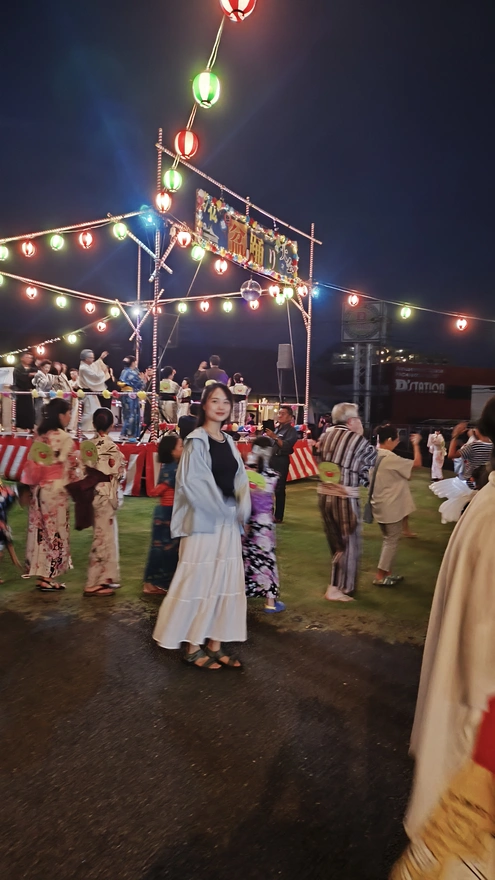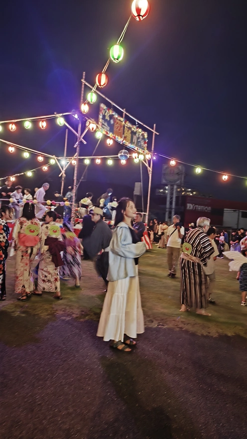 6.綺麗な浴衣を着た女性たちや子ども、家族がたくさん来ていた。舞台をぐるっと囲んで、みんなが踊り始めた。日本人は毎年やっているから、この踊りをよく知っているみたい。私には初めてだよ、気になった。私も踊りたい ><。そしてこのとき気づいた。「この半ふんズボンじゃなくて、スカートにすればよかった!コーデミスだわ!」最近 GU で買った白いスカートを思い出して、家まで走って着替えてから戻ってきた。