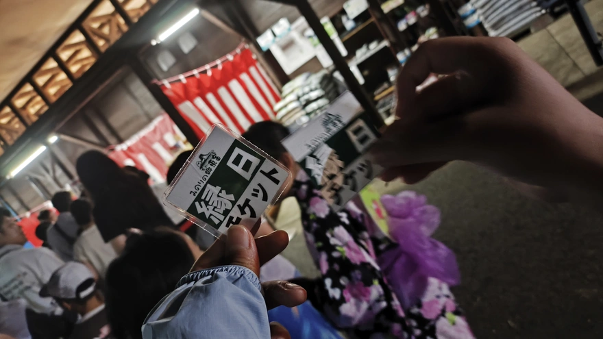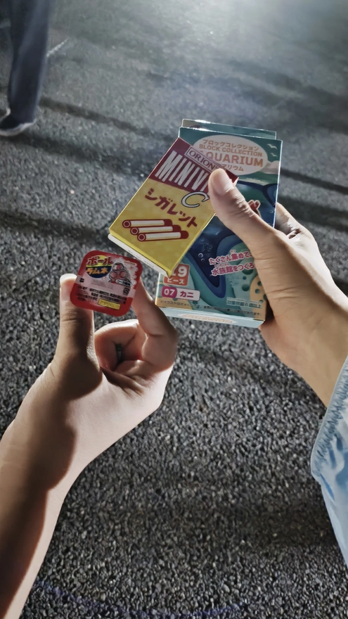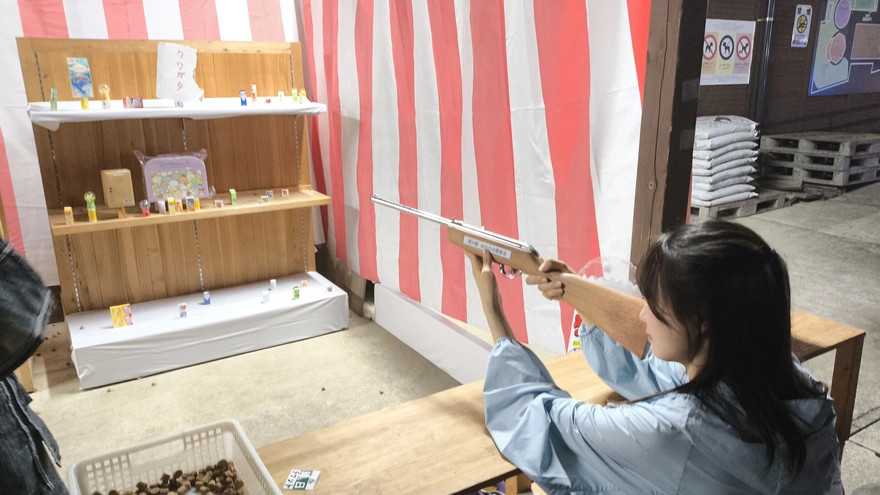 12.終わったあと、さっき屋台でもらったチケットのことを思い出した。「縁日」と書いてあって、ちょうど2枚もらったけれど、これで何ができるのかは知らなかった。そして、「縁日」と書かれている屋台に行ったら、かわいいゲーム屋台が3つくらいあった。私たちは射的を選んだ。弾は2発ずつもらった。