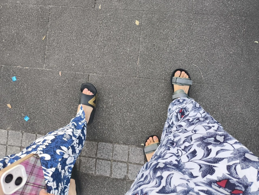 だって、生地の質感でわかるけど、これ100%コットンた!帯で浴衣をぎゅっと結んだら、歩きにくくなっちゃった。アハハ。