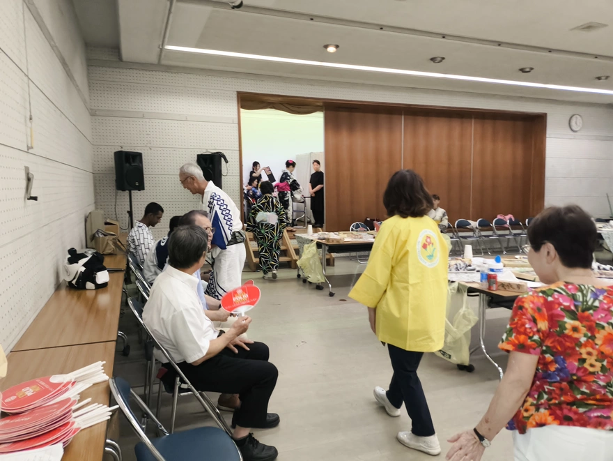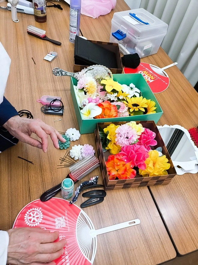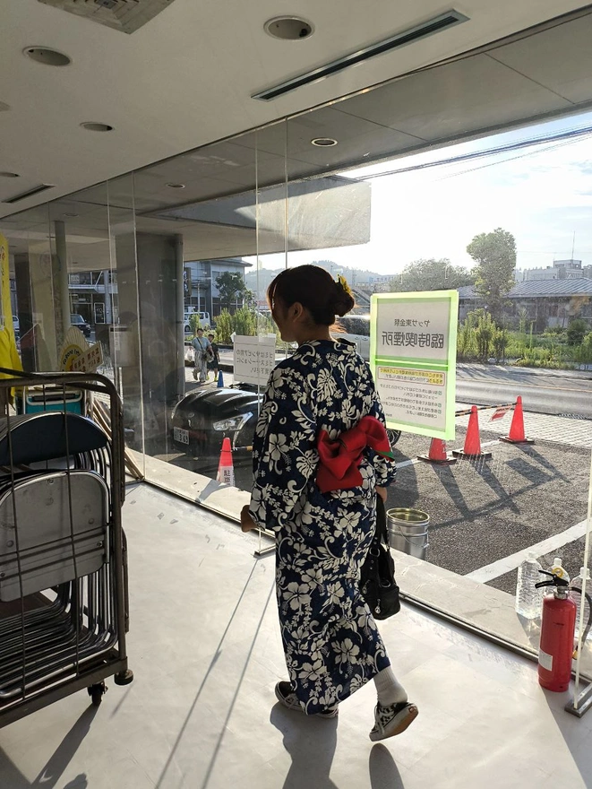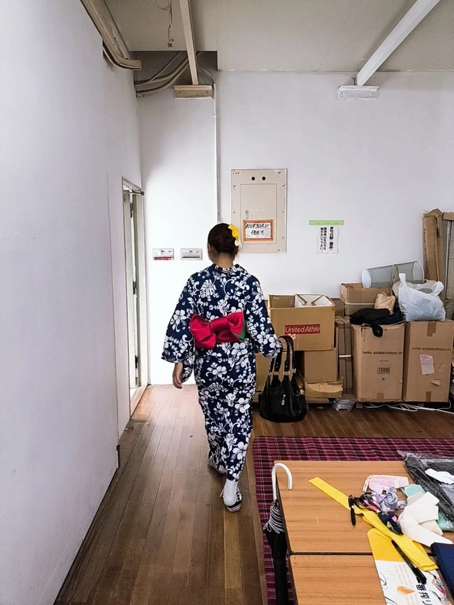 4.本物の浴衣を着るのは人生初めてだったので、とてもワクワクしました。たくさんの模様の布の中から自分の好きなものを選べることができて、私はピンク帯広のやつを選びました。それから、可愛いおばあちゃんたちが浴衣を着るのを手伝ってくれました。