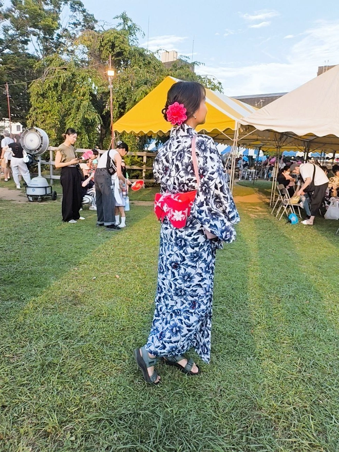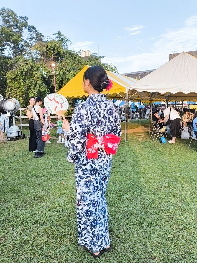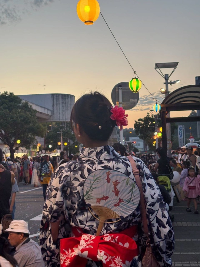 5.後ろから見る浴衣は本当に綺麗です。特に、帯とヘアーの飾り。ダイソーで買って来た100円の金魚うちわも全部完璧。めっちゃ夏っぽい、めっちゃ日本っぽい。そして写真では楽そうに見えるけど、実はちょっと足が不便だった。