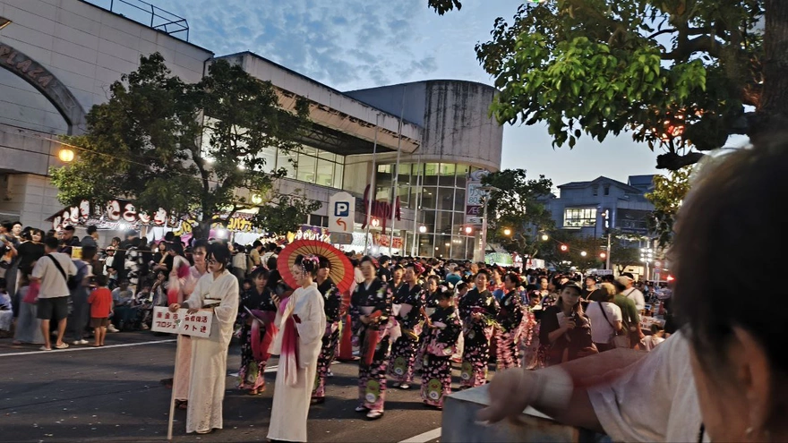 14.七時になって、本番のイベントが始まりました。先ずは綺麗な着物を着た女性たちが、何かダンスのようなマーチングをしていた。この日のために沢山パフォーマンスを準備してきた感じがした。みんな綺麗だね~。私も着物着てみたいな~。で、次は外国人たちの番だった。「え?!私も外国人だよ!私も参加できるの?!どうやって踊ればいいのかわかんない!でいうかみんないつも練習してたの?」