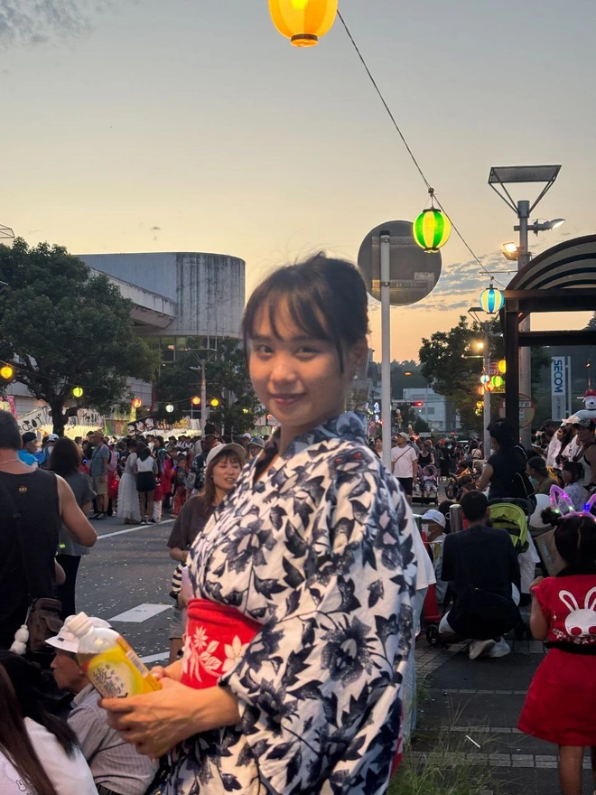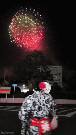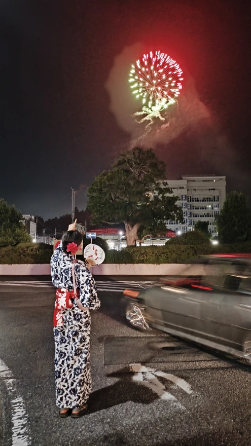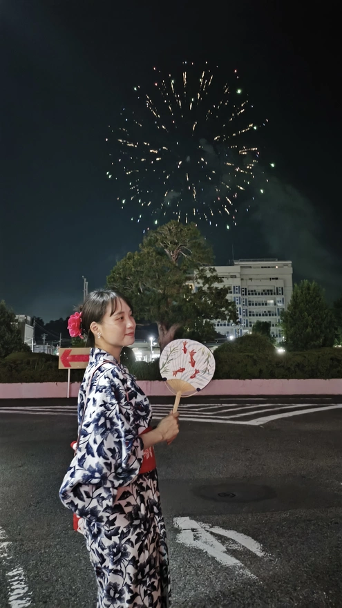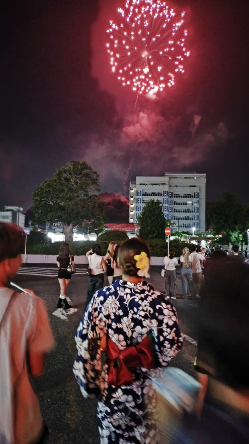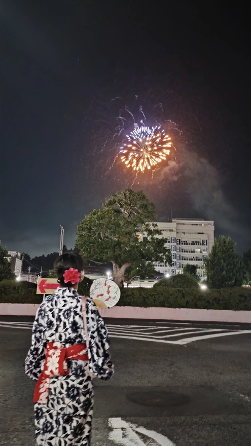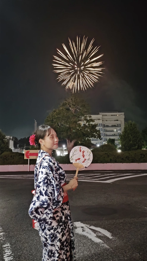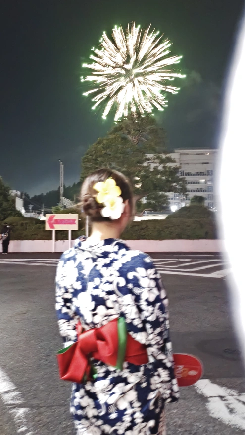 17.そして次最後は見えないどこから花火が上がりました。前ここで桜祭りの時お同じ花火を見たことある。あの時は一人で見たけど、今回は一緒!そして浴衣も着て写真撮るのは初めてだ。こんな姿あアニメで見たことある!今日はマジで日本あアニメの主人公になった気分だ。私が想像した日本生活と同じ。夢が叶える瞬間だったわ。