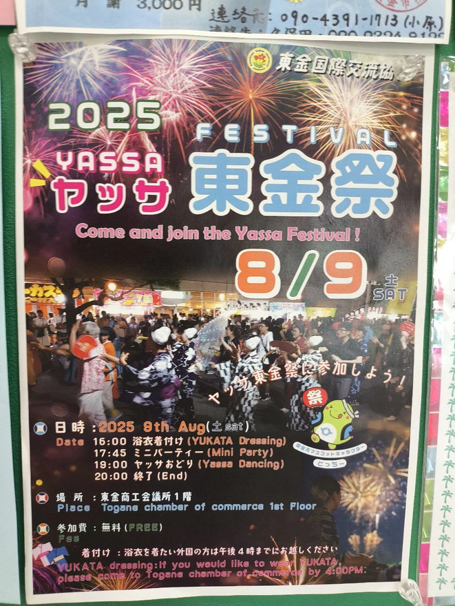 1.8月9日は私が住んでいる村のお祭りの日だった。ヤッサ祭りだって、アニメで見た記憶がある。けど、一体どんな祭りでしょうか、それは私にとって新しい経験になりそうでした。いつも利用しているデパートの黒板でこんなチラシを見つけました。