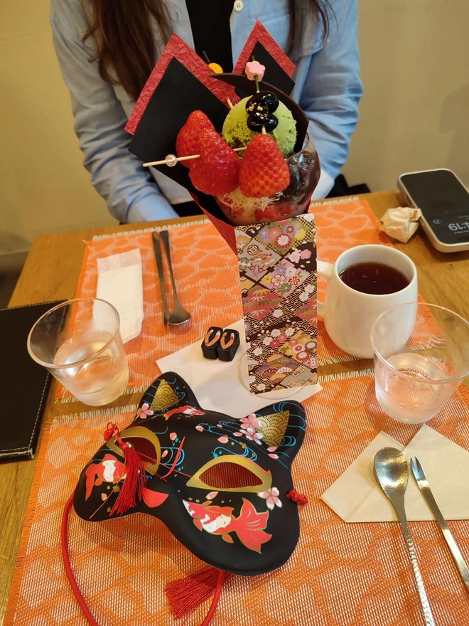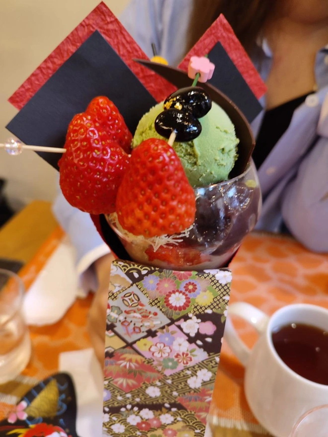 12.休憩するためにカーフに来ました。めっちゃ日本ポイデザートを頼んた。これは抹茶じゃなくて、ピスタチオ。「くくり姫の嫁入り」と言う名前のパフェ。マジで和装を着ている女の子の姿をやっている。高下駄もある。めちゃ可愛い。店員さんが説明しながら高下駄の動画を見せてくれた。優し。