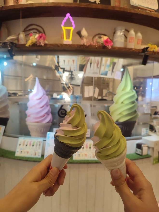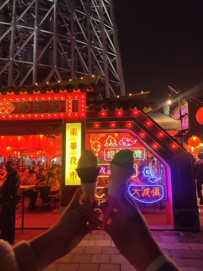 15.東京スカイツリーまで来たのに、残念ながら上るのはやめた。天気が良くなくて、曇っているから登っても何も見えない。代わりにその辺でアイスを食べた。私が選んだのはコーンが黒いやつだったけど、味は普通のコーンと同じ。どこかに座って、おしゃべりしながらアイスを食べた。